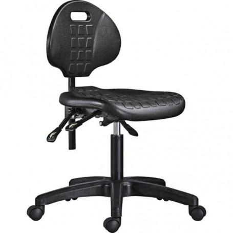 Assise et dossier en bois multiplis recouvert de polyuréthane. Dossier à contact permanent réglable en hauteur. Vérin à gaz, piétement à 5 bras avec patins ou roulettes. L x P : 43 x 46 cm Hauteur assise standard : 420/560 mm Hauteur assise haute : 560/810 mm 75% recyclable